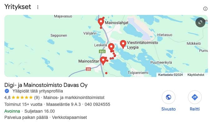 Googlen yritysprofiili, on maksuton työkalu, jonka avulla yritykset voivat hallita ja optimoida näkyvyyttään Googlen hakutuloksissa ja Google Mapsissa.