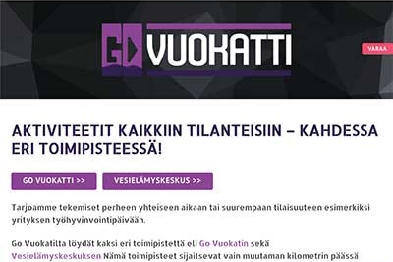 Olemme toteuttaneet useita kotisivuja Vuokatin, Suomussalmen ja Hossan alueilla toimiville yrityksille ja yhdistyksille. Vuokatti tunnetaan monipuolisista matkailu- ja urheilupalveluista, Hossa kansallispuistosta ja luontomatkailusta, sekä Suomussalmi vireästä paikallisesta elinkeinosta. Kotisivumme tukevat niin matkailuyritysten kansainvälistä näkyvyyttä kuin paikallisten palveluiden saavutettavuutta, aina moderneina, hakukoneoptimoituina ja mobiiliystävällisinä.